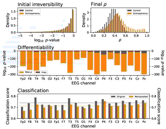 I start the analysis by illustrating the process on the first EEG electrode, i.e., Fp2. We calculate the irreversibility of its time series by randomly extracting 100 short segments (of 100 points each, i.e., s) from all subjects, and obtaining p-values according to the Costa index test. As can be appreciated in the top left panel of Figure 7, most segments are time-reversible, with weak differences present between the two conditions. Specifically, a two-sample Kolmogorov–Smirnov test calculated between the two distributions yields a p-value of . I then applied the manipulation procedure described in Section 3.2, aimed at increasing the irreversibility of these time series, and evaluated the resulting between the manipulated and original segments. The results are represented in the top right panel of the same figure, and suggest the presence of a significant difference between both groups (p-value according to the same test). In other words, even if both groups of segments have the same initial irreversibility, they present different distances to irreversibility, and this is smaller (i.e., manipulations of smaller amplitudes are needed to reach irreversibility, hence yielding a higher ) for schizophrenic patients. Such differences between control subjects and patients can be observed across all EEG channels, with p-values for the differences between s always being smaller than those yielded by the irreversibility test on the raw data—see, respectively, the orange and grey bars in the the middle panel of Figure 7.