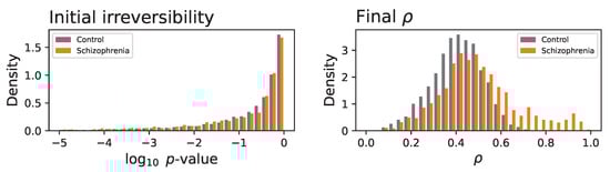 As a final test, Figure 8 reports the results when modifying time series corresponding to the Fp2 channel with the aim of reducing the time irreversibility; in other words, the two panels in Figure 8 correspond to the same panels in Figure 7 when applying the procedure described in Section 3.3. Notably, the results are very similar, with time series corresponding to schizophrenic patients also being easier to modify towards reduced irreversibility. As in the previous cases, this is confirmed by a two-sample Kolmogorov–Smirnov test, yielding p-values of and for the distributions in the left and right panels, respectively.
