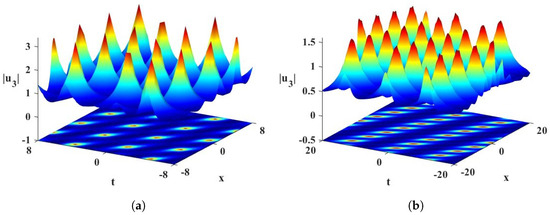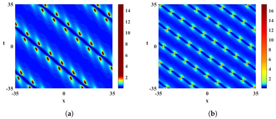 Similar to , is also related to and , but it is not symmetric with regard to and , that is, . Graphically, the amplitude of is very large while , and we thus set to obtain several beautiful structures. When , the evolution of is displayed in Figure 4a. When and , the evolution of is displayed in Figure 4b. Both of them are double-periodic solutions. As the values of and increase, the period becomes small. The relationship between the amplitude and the parameters and is rather complicated, and we have not obtained the specific relationship.