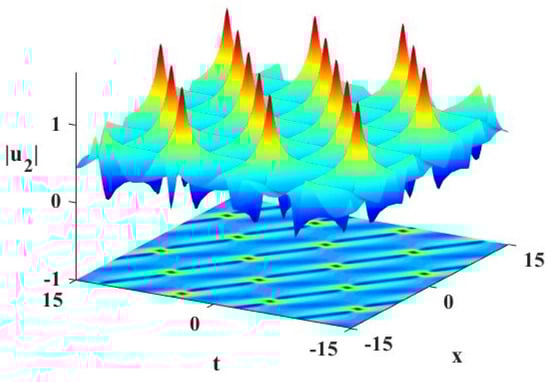Like the first-order solution, this second-order solution is symmetric with respect to and , namely, . We now consider its dynamics. For and , as well as for and , two regular double-periodic solutions are displayed in Figure 2. Due to the interaction between the two first-order waves, the amplitude increases in some regions and decreases in others, resulting in a lattice-like appearance of the second-order solution’s trajectory. Ref. [26] also presents a similar solution, but our results differ from theirs. Their solutions are derived from a non-zero boundary condition, whereas our solutions are derived from a zero boundary condition.