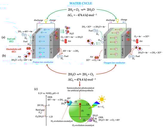 Schematic representations of electrochemical reactions in the solid oxide (a) fuel cells (SOFCs), (b) electrolytic cells (SOECs), and (c) photocatalytic water splitting regarding the water cycle. Green and red arrows in (a,b) indicate the half-reactions at the anode and cathode of the fuel cell and electrolytic cell, respectively. Two types of conductors (proton and oxygen ions) exist in solid oxide-based cells. SOFC and SOEC are two key components in the energy transition, corresponding to gas to power (G2P) and power to gas (P2G) processes, respectively. In (c), oxide-based photocatalytic water splitting occurs via three mechanistic steps: (1) exciton (electron–hole) excitation through light absorption (photocatalyst + h e− + h+), (2) charge separation and migration of charge carriers toward the photocatalyst’s surface, and (3) surface reactions (HER at the conduction band (CB) and OER at the valence band (VB)). NHE refers to the normal hydrogen electrode.