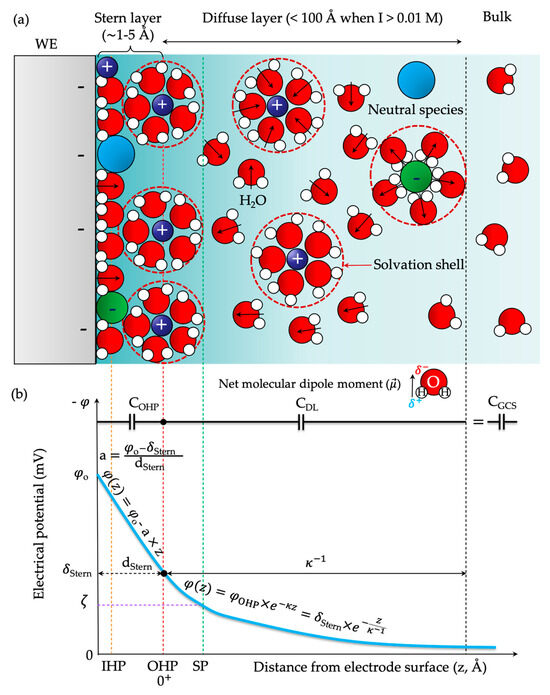 Later on, Grahame (1947) introduced the adsorption phenomena of specifically adsorbed species and non-specifically adsorbed solvated ions to the GCS model, which was constructed via long-range Coulombic forces and overlooked the chemical identities of counterions [75]. Grahame defined an inner plane in the Stern layer (inner Helmholtz plane, IHP) that some non-hydrated coions, partially hydrated counterions, and neutral molecules act as adsorbates to tightly attach to the electrochemical interface via peculiar short-range interactions (orange dashed vertical line in Figure 3). That determines the two sub-layers in the Stern layer: IHP consists of “specifically adsorbed” species while OHP is the plane of “non-specifically adsorbed” counterions’ residence (Figure 3a). The organization of species at IHP was totally dependent upon the applied potentials, electrolyte’s nature and concentration, and electrode characteristics. Furthermore, Bockris, Devanathan, and Müller (1963) sharpened the GCS model by designating the variation of water solvent’s relative permittivity [76]. To be more specific, the rotation intactness of water’s “effective” dipole moment from their collective alignment reduces strongly from IHP to OHP until the diffuse layer (bulk-like water is free to rotate with more or less no alignment) despite retaining the dipole moment of individual water molecules with ca. 1.85 D (Figure 3a). Within IHP, a packed monolayer of water under the influence of a strong electric field leads to its dielectric saturation, while water in hydration shells has a more randomized orientation compared to IHP but is still aligned. The dielectric strength of water, then, decreases when going further into the interface. Figure 3 demonstrates the holistic picture of the electrical double layer model. There are numerous review papers discussing the EDL elsewhere [77,78], which readers can refer to and look into in detail.