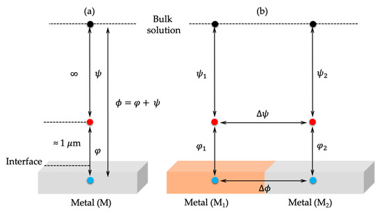 Schematic illustrations of the discrepancies among (a) surface potential (), outer/external potential (), and inner/internal potential () of metal M, as well as (b) the Volta () and Galvani () potential differences between two metals M1 and M2. This figure is adapted from the reference [72], Copyright © 2022 The Electrochemical Society of Japan.