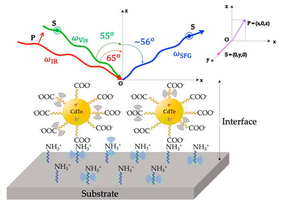 SFG is a versatile technique to study the fundamental characteristics of interfaces: electrochemical interface, nanostructured metal interfaces (plasmonic), and semiconductors (excitons) for the development of biosensors and electrocatalysts [87]. SFG is known as intrinsically surface-sensitive spectroscopy, which is almost the case for species adsorbed at interfaces [88]. In the case of functionalized nanoparticles (Au or functionalized quantum dots, CdTe) grafted with anchoring molecules on a solid substrate (metal, glass, prism...), the SFG signal is derived from grafted or functionalized molecules, substrate, and nanoparticle responses. However, inorganic components (e.g., substrate and nanoparticles) are generally non-resonant to IR vibrational frequencies of the examined range. Taking mercaptopropionic acid ligand-capped CdTe quantum dots (QDs) grafted on the glass substrate through (3-aminopropyl)triethoxysilane (APTES) molecules as an actual instance, it is a combined contribution of the inorganic components of the samples (glass slide and CdTe core) () and the remaining part from organic components (APTES or functionalized molecules on QDs) (Figure 6). As a result, the effective surface second-order non-linear susceptibility or of the interface is expressed as below.