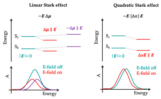 It is stated that when the permanent dipole moment of the molecule is nonzero, the second-order Stark effect contribution is negligible and generally not taken into account [99]. To be more specific, the strength of the electric field is relatively weak (smaller than 100 MV∙cm−1), the second-order contribution of (quadratic term) is insignificant, and becomes directly proportional to the magnitude of via a linear relationship (Equation (13)) (Figure 7). This means that the linear Stark shift increases when a higher external electric field impinges on the electrode system.