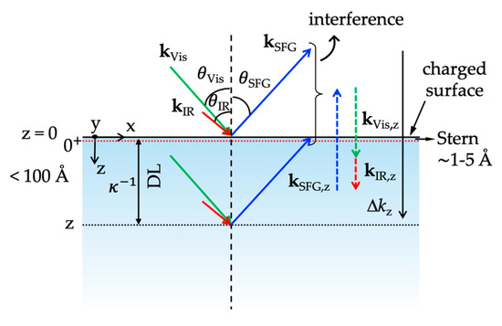 where and designate the second-order electric-quadrupole bulk non-linear susceptibility and the third-order bulk non-linear susceptibility of the aqueous solution, respectively, is the -dependent static electric field, represents the bulk solution and represents the phase mismatch of reflected SFG light along the surface normal (with direction) (Figure 8).