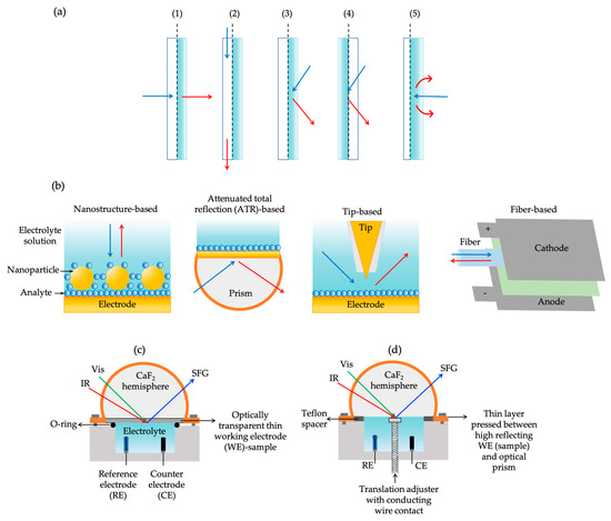 One of the fundamental limitations of linear optical spectroscopies (UV-Vis and IR) in the external reflection spectroscopic mode (normal mode) is that they are bulk sensitive [55]. The selectivity and sensitivity of interface data acquisition do not yield solely from the electrical double layer (EDL) surface region but also emanate largely from bulk contributions. To address this issue, an even-order non-linear optical spectroscopy is utilized to provide a plausible solution to surface insensitivity. Vibrational sum frequency generation spectroscopy (SFG or VSFG) or sum-frequency vibrational spectroscopy (SFVS) suffices the demand for an in situ molecular-specific and inherently surface-sensitive technique for analyzing the chemical vibrational data fingerprint of molecules at electrode–electrolyte interfaces. The innate symmetry breaking at electrochemical interfaces is the hallmark of symmetry rules to achieve SFG signals. One appealing feature SFG offers is the congruence of operation on both well-defined single crystals and rough electrode surfaces. Even though SFG seems to be a potentially applicable probing method, electrochemical interface analysis remains a challenging task by virtue of the intricate nature of the interfaces and the inadequately developed and limited variety of methodologies. Traditional homodyne SFG is not able to allocate the separation of the real and imaginary parts of the interfacial vibrational signal and thereby reveal an equivocal determination of molecular organization [56]. Phase-sensitive/-specific or heterodyne-detected SFG (PS-SFG or HD-SFG) advances the surface sensitivity, reaching sub-monolayer surface coverage as low as a few percent of a monolayer compared to its predecessor (direct or homodyne SFG) [57]. These merits could be decisive elements for probing electrode–electrolyte interfaces by PS-SFG vibrational spectroscopy under operando conditions.