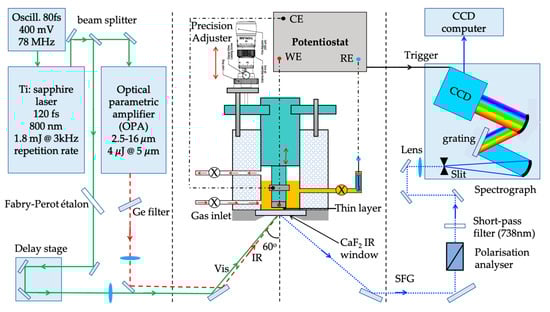 - Lu, G.Q.; Lagutchev, A.; Dlott, D.D.; Wieckowski, A. Quantitative vibrational sum-frequency generation spectroscopy of thin layer electrochemistry: CO on a Pt electrode. Surf. Sci. 2005, 585, 3–16. [Google Scholar] [CrossRef]
