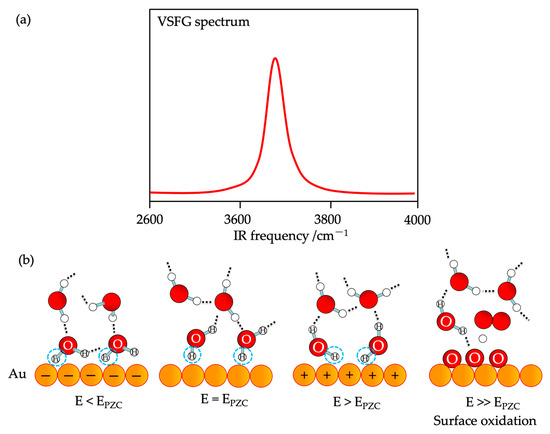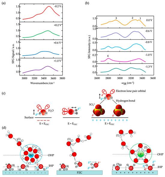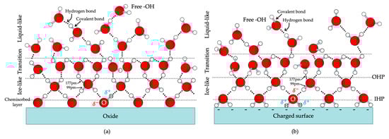 ≡RO− + H+ with ), (4) ion adsorption from surrounding aqueous solution (Al2O3), and (5) surface complexation through chemical complexion reaction [12]. Amongst these five particular ways of a charged surface generation, the charged electrode–electrolyte interface (origin (1)), which is defined as the electrochemical interface or electrified interface (EI), is the centerpiece of sustainable energy conversion and storage systems (batteries, supercapacitors, fuel cells, corrosion, etc.). Electrochemical interfaces are directly related to structural dynamics and heterogeneity, specifically, the charge and ion transfer at the interface boundary of the metal (electron conductor) and the aqueous electrolyte (ion conductor), which is the core of decisively manipulating the efficiency of electrochemical energy conversion [13]. On the one hand, the pursuit of optimizing the matching between the novel electrolyte and modified/functionalized electrode materials, and discovering next-generation electrocatalysts to improve the overall electrochemical performance is mainly inclined to more preference. On the other hand, the knowledge of the dynamic nature of aqueous electrochemical interfaces is still overlooked and insubstantial. Therefore, to understand the mechanism of electrochemical transitions under an aqueous medium, in-depth insight into water interfaces must be addressed and analyzed.