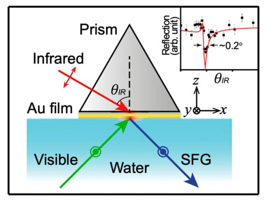 Sum-frequency generation (SFG) spectroscopy is a second-order nonlinear optical probe describing a conversion of two processes: an absorption of an infrared (IR) photon, proceeded by an anti-Stokes (AS) Raman scattering of a visible (Vis) photon (or near IR 800 nm which historically was defined as visible in femtosecond SFG setups). Provided that the generated photon acquires , incident laser beams, a sum-frequency photon is detected. Therefore, to efficiently generate an SFG photon from combining 106 Vis photons and 106 IR photons, it is a must for two intense laser beams to spatially and temporally overlap at the probed interface so that two conservation laws are met: (energy) and (momentum or phase matching condition) [85]. By convention, the energy conservation law is stated in frequency () but expressed in wavenumber ( in cm−1) in the practical sense. The frequency terms, henceforward, will literally mean the energy marked in cm−1 in SFG spectra and other analyses. A detailed comparison between SFG and two individual constituent spectroscopies (IR and Raman) is represented in Table 1.