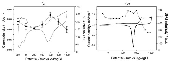- Tadjeddine, A.; Peremans, A.; Guyot-Sionnest, P. Vibrational spectroscopy of the electrochemical interface by visible-infrared sum-frequency generation. Surf. Sci. 1995, 335, 210–220. [Google Scholar] [CrossRef]