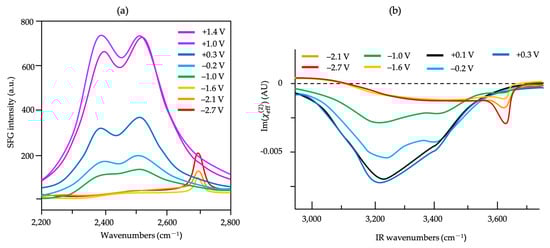 When studying the SFG spectroscopy of an electrochemical interface, a charged solid/liquid interface in general, a quadrupole contribution of bulk centrosymmetric component under the influence of a static electric DC field through a surface non-specific process is also recognized in the generation of SFG resonances rather than the symmetry-breaking interface contribution itself. In the early 1990s, Eisenthal et al. proved that the signal of second harmonic generation (SHG) depends on the -bulk component with a significant contribution [102,103]. As discussed previously in Section 2 about the EDL models of an electrochemical interface, the interface contribution to can be regarded from the Stern layer () with the interface-specific hydrogen-bonding network of water molecules [68]. On the other hand, the bulk quadrupole contribution is referred to as bulk-like water molecules in the diffuse layer (DL) under the effect of a static electrical field. The effective surface second-order non-linear optical susceptibility , therefore, is expressed via the relation below: