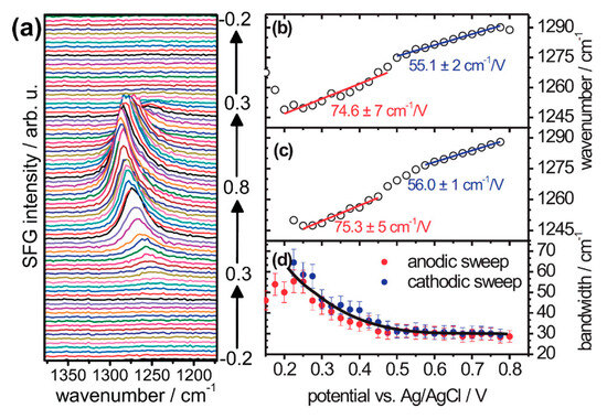 This denoted correction factor is estimated from the data fitting procedure of experimented vibrational spectra under the umbrella of the Stark effect (normally between 1.1 and 1.3) [95,98]. Meanwhile, there are other polarization effects devoted to the frequency shift of a particular vibrational mode, such as dipole–dipole coupling, hydrogen bonding, ionic strength effect, etc. As water is a common polar solvent with strong associated hydrogen bonds between moieties containing high-electronegativity atoms (F, O, N…) in solute molecules and hydrogen atoms in water molecules, these interactions are likely to alter the chemical nature and electronic structure of the vibrational mode leading to the shifting of . Furthermore, it is known that the internal solvation field is –driven field ( is not constant) when imposing an electric field bias. Within the scope of this review, other contributing parameters to variation stated above are negligible by keeping them constant, so the primary variable is the influence of the interfacial electric field produced from the electrode surface on the vibrational probe.