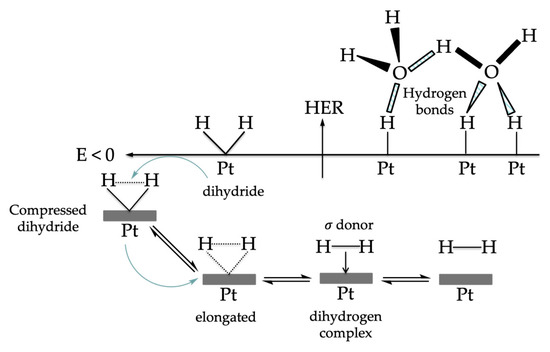 At electrochemical interfaces, the active sites are the key features that drive the electrochemical mechanism in electrocatalysis (specifically HER in Figure 2a,b and OER in Figure 2c). At the microscopic scale, adsorption layers close to the metal surface form a specific configuration for charge transfer and water reactivity. Water molecules and solvated adsorbate ions interplay in close proximity via covalent bonds and three other types of weak intermolecular interactions (van der Waals/ London dispersion interactions, electrostatic forces, and hydrogen bonds) [14,15]. Thus, knowing how to manipulate and control their structure, composition, and density could ameliorate the kinetics and robustness of the metal surface. Regarding the critical factors maneuvering the complexity of electrochemical interfaces, they can be derived from: (1) the chemical nature of the electrode surface structure, (2) the composition of the electrolyte solution (multivalent ions), and (3) the environmental conditions (concentration, pH, ionic strength, temperature) that affect the structure of adsorbed layers [12,16]. Nevertheless, the pattern of adsorbate layers (ad-layers) is primarily contingent upon an external electrical potential between the working electrode surface and a counter electrode. In principle, when applying a negative/positive potential on the working electrode, the energy level of electrons on that electrode increases/decreases (surface charge accumulation), resulting in attracting atoms that bear a partially positive (δ+) electric charge or being attracted by atoms that bear a partially negative (δ—) electric charge, respectively. These propensities navigate surface charge and absorbates’ orientation and reorganization of electrochemical systems. Hence, the potential-dependent behavior of the electrochemical interface displays a kinetic and dynamic delineation of the electrode surface and adsorbed species and water molecules chemistry.