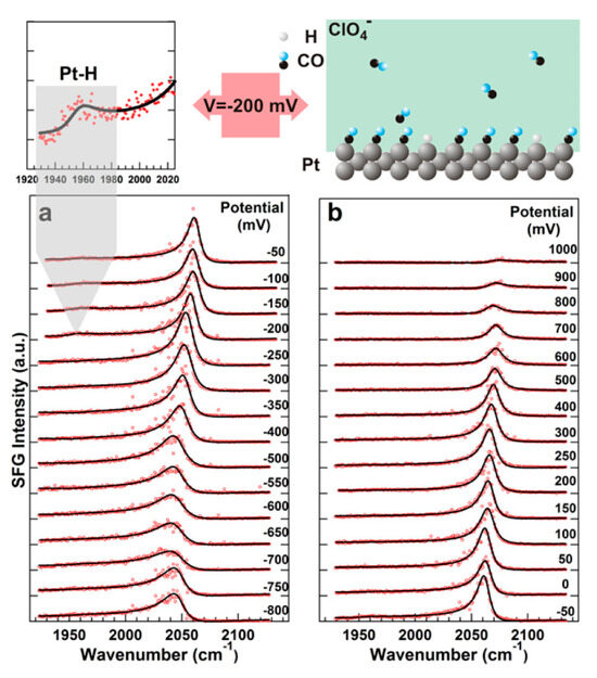 - Yang, S.; Noguchi, H.; Uosaki, K. Electronic Structure of the CO/Pt(111) Electrode Interface Probed by Potential-Dependent IR/Visible Double Resonance Sum Frequency Generation Spectroscopy. J. Phys. Chem. C 2015, 119, 26056–26063. [Google Scholar] [CrossRef]