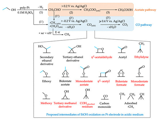 - Gomes, J.F.; Bergamaski, K.; Pinto, M.F.S.; Miranda, P.B. Reaction intermediates of ethanol electro-oxidation on platinum investigated by SFG spectroscopy. J. Catal. 2013, 302, 67–82. [Google Scholar] [CrossRef]