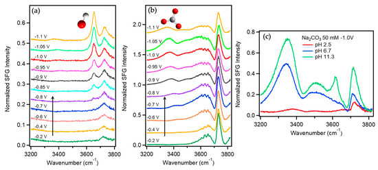 - Noguchi, H.; Okada, T.; Uosaki, K. SFG study on potential-dependent structure of water at Pt electrode/electrolyte solution interface. Electrochim. Acta 2008, 53, 6841–6844. [Google Scholar] [CrossRef]