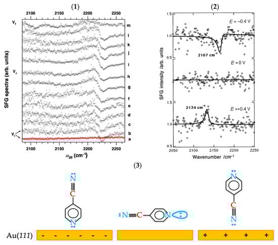 - Pluchery, O.; Tadjeddine, A. Investigation of the adsorption of 4-cyanopyridine on Au(111) by in situ visible–infrared sum frequency generation. J. Electroanal. Chem. 2001, 500, 379–387. [Google Scholar] [CrossRef]