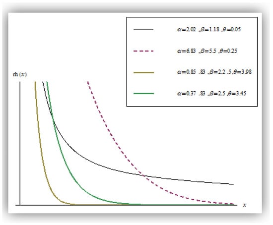 For the number of the surviving units x and the population parameter values of the shape parameters, the ML estimates of the parameters , and are obtained. Also, the rf and hrf are calculated using the ML estimates of the parameters. The computations are performed using Mathematica 11.
