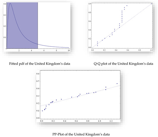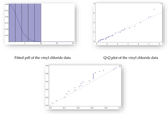 Figure 4 displays the fitted pdf, PP-Plot, and Q-Q plot of the EG-Xg distribution for the vinyl chloride data. Also,
