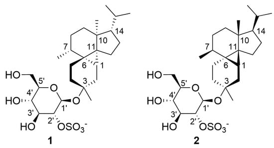 ChemDraw renderings of the two possible diastereomers of Peyssonnoside A. Stereodescriptors of diastereomer 1: (1′S, 2′R, 3′S, 4′S, 5′R, 1S, 3R, 6S, 7R, 10S, 11S, 14S), 2: (1′S, 2′R, 3′S, 4′S, 5′R, 1R, 3S, 6R, 7S, 10R, 11R, 14R).