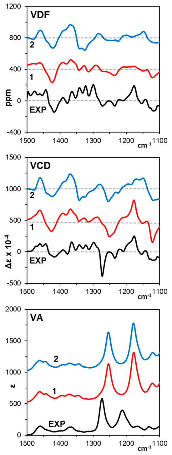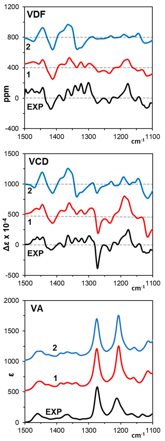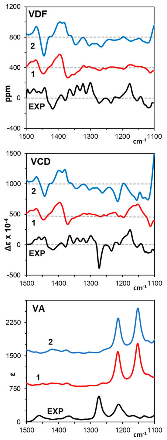 The quantitative similarities between the predicted spectra of 1 and the experimental spectra are SimVCD = 0.30 and SimVDF = 0.27, while corresponding values for 2 are 0.14 and 0.23, respectively (see Table 1). These magnitudes are quite low for suggesting reliable AC, and this was the reason for not being able to assign the AC of Peyssonnoside A from VCD spectra previously [27]. This negative conclusion motivated us to explore different levels of theory for VCD predictions.