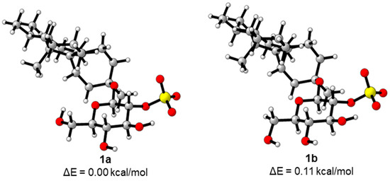 Optimizations of 1 and 2 at the B3PW91/6-31G(2d,p) level gave a total of 11 conformers for 1 and 10 conformers for 2 within a 2.0 kcal/mol window, which is a small number of conformers similar to the low number of low-energy conformations obtained previously (five for each diastereomer) [27]. It is likely that the diterpene unit at the anomeric carbon prevents the otherwise flexible sugar moiety from puckering, thereby limiting the ring to one favorable chair position. Additionally, the C-3 alcohol group is pointing towards one of the oxygens in the C-2 sulfate group, locking both into place and further limiting the number of obtained conformers due to this favorable intermolecular interaction. This oxygen also has a shorter S=O bond length, likely due to the stabilizing hydrogen bonding interaction from the C-3 hydroxyl group.