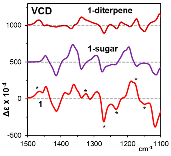 VCD spectra of diastereomer 1 and its optimized sugar (1-sugar) and diterpene (1-diterpene) fragments at the B3PW91/6-311G(3df,2pd)/PCM level. All VCD intensities are scaled by 2 for consistency with the other figures. Bands denoted with an asterisk (*) have significant contributions from the diterpene unit to the spectrum of the whole molecule. Frequencies are scaled by 0.980.