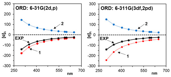 ORD curves for 1 and 2 at the B3PW91/6-31G(2d,p)/PCM level (left) and at the B3PW91/6-311G(3df,2pd)/PCM level (right).