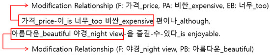 Table 2 shows a list of tags used to represent all modification types described in Table 1 within Korean sentences. Predicate words, negation words, and emphasis words are represented using prepositional and postpositional tags. These tags are assigned based on their modifying words and word orders, reflecting the symmetric nature of the modification relationships. Figure 1 shows an example of a Korean sentence where multiple modification relationships are tagged using the definitions provided in Table 2. Through the use of these prepositional and postpositional tags, we can accurately extract modification relationships related to features such as ‘price’ and ‘night view.’ For instance, the word ‘expensive’ is tagged as a postpositional predicate word, indicating its role in modifying the preceding ‘price’ feature. Similarly, the word ‘too’ is tagged as a prepositional emphasis word, signifying its modification of the subsequent ‘expensive’ word.