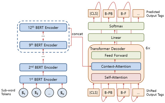 Most of the transfer learning-based models for named-entity recognition (NER) in various fields use the BERT (Bidirectional Encoder Representations from Transformers) model [1,2,3,4,5]. This is due to its ability to capture contextual information bidirectionally (from both left and right contexts), which enables it to comprehend the meaning of sub-words/words within a sentence based on their context [6,7]. Transfer learning approaches can be categorized into fine-tuning and feature-based approaches [6]. The fine-tuning approaches simply add an additional layer to the final layer of the BERT learning framework and conduct fine-tuning across the entire network, utilizing only the BERT encoders. On the other hand, feature-based approaches employ both encoder and decoder layers of attention-based transformer models [7]. Thus, the hidden vectors from either the penultimate layer or the last four layers of the BERT-based pre-training network are used as only the input features for one or more decoder layers of the transformer network without fine-tuning any parameters of BERT.