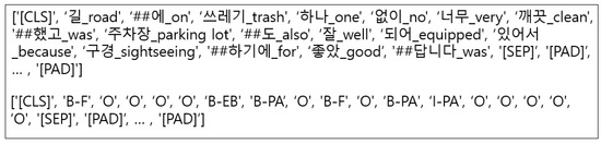 In the experiments and validation of our transfer learning-based named entity recognition algorithm for modification relationships, we employed Huggingface’s BERT word-piece tokenizer [20,21] along with the ‘kcbert-large’ and ‘koBERT’ pre-trained models [22] available both on the HuggingFace Model Hub [23]. The ‘kcbert-large’ model, which is pre-trained on a corpus of 110 million comments from Naver News [24], the largest news portal in Korea, is well-suited for extracting information from TripAdvisor review data, as it was trained on actual user comments. The ‘koBERT’ model, pretrained on approximately 50 million sentences from Korean Wikipedia text, represents written language and thus differs slightly from the colloquial user review data. It is utilized to validate our proposed model across various pretrained models. For training the decoder layers, the tagged TripAdvisor data were randomly split into a training dataset (70%) and a test dataset (30%).