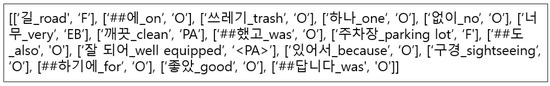 For the final data tagging in the training and test data of the transfer learning model, we created B (Begin) and I (Inside) tags for each category defined in Table 2, along with an O (Outside) tag for non-named entity words. These tags are as follows: B-F, I-F, B-PB, I-PB, B-PA, I-PA, B-NB, I-NB, B-NA, I-NA, B-EB, I-EB, B-EA, I-EA, O. This tagging system aids in precisely recognizing the relationships among various combinations of nouns, predicates, negation words, and emphasis words.