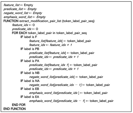 Figure 5 shows an algorithm for extracting modification relationships, which determines which predicate words actually modify which features, or which negation or emphasis words modify which predicates, from the sequence of vocabulary tokens and named-entity tokens obtained through the BERT-based NER algorithm described in Section 2.2.1. In order to extract the exact pair of modification relationships from the sequence of positionally named entity tokens, the following algorithm is used: