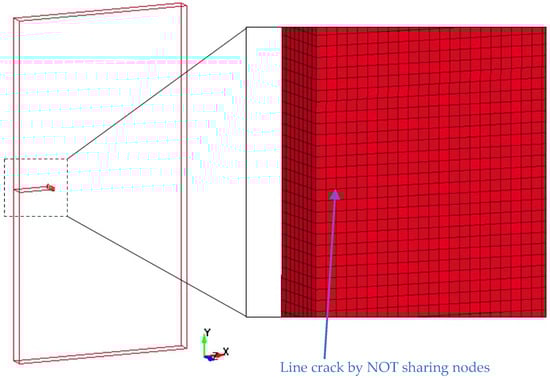 The previous section, Section 2.3, demonstrated the feasibility of using the element deletion method to calculate the critical energy release rate. In this section, we will implement this method for dynamic crack propagation. The 3D thin plate still has dimensions of in length, in width, and in thickness. This simulation model has a line crack of as shown in Figure 5. A line crack is modeled by not letting the adjacent elements share nodes.