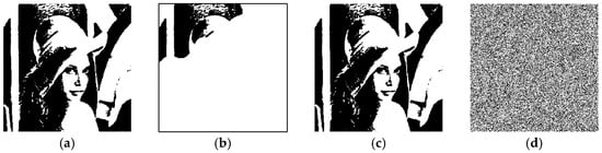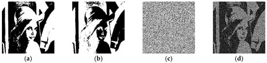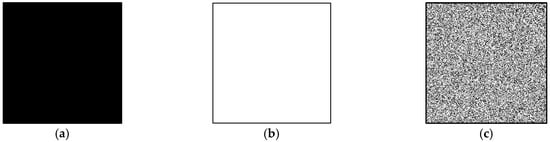 where xi, j is the pixel of X at the position (i, j). Therefore, when T[X] is equal to 0, the entire image will consist of black pixels, as shown in Figure 2a. Conversely, when T[X] is equal to 1, the entire image will be completely white, as shown in Figure 2b. When T[X] is set to , the entire image will appear as a half-black and half-white composition, as depicted in Figure 2c. Note that a white pixel is denoted by 0, but the light transmission of a white pixel T[0] = 1; a black pixel is denoted by 1, and the light transmission of a black pixel T[1] = 0.