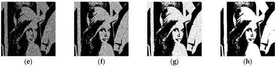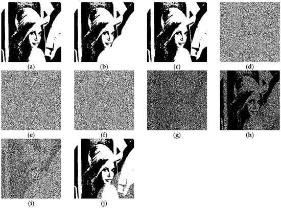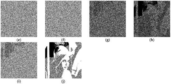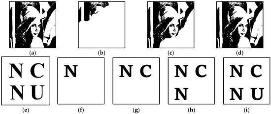 The content of lower secret levels is nested within higher secret levels, as illustrated in Figure 5. Figure 5a,e represent the original secret images, Figure 5b–d depict the secret levels when q = 3 for Figure 5a, and Figure 5f–i represent the secret levels when q = 4 for Figure 5e. It is evident from the above explanation that when referring to the secret level Slq, the secret level Slq is equal to the secret image S.