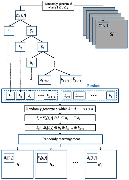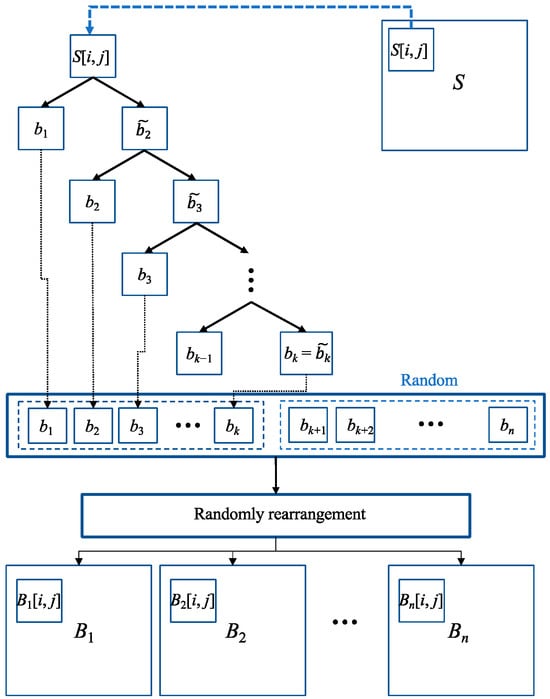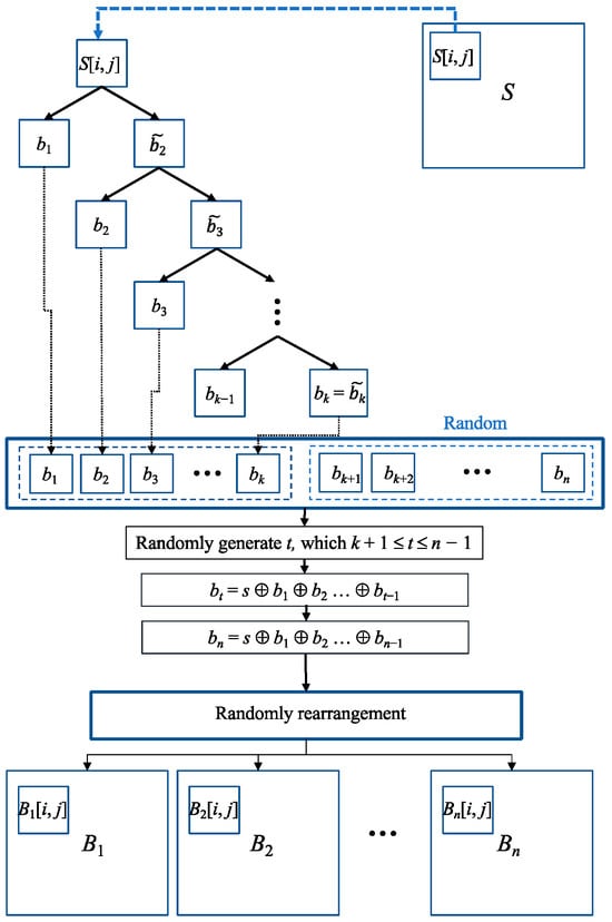 In the algorithm for (k, n) RG-based VCS [5], we perform encryption on each pixel, employing the (2, 2) RG-based VCS method. Here is how it works: we take a single pixel s from the secret image and encrypt it into two pixels, b1 and . We then treat as the secret pixel and encrypt it to obtain b2 and . We continue this process iteratively until is generated, as illustrated in the flowchart in Figure 4. Subsequently, bk+1 to bn are randomly assigned values of 0 or 1. At this point, we have obtained b1, b2, …, bn. From the flowchart in Figure 4, it is evident that b1 to bk−1 and bk+1 to bn are randomly generated, similar to Step 2 in the (k, n) RG-based VCS algorithm. Only bk is computed and is the result of repeatedly applying the (2, 2) RG-based VCS process. Consequently, we can generalize bk as the result of s ⊕ b1 ⊕ b2 … ⊕ bk−1, just as in Step 3 of the (k, n) RG-based VCS algorithm. Once this process is completed for each pixel [i, j] of the secret image S, these n pixels are randomly distributed across B1, B2, …, Bn, finalizing the encryption in (k, n) RG-based VCS.