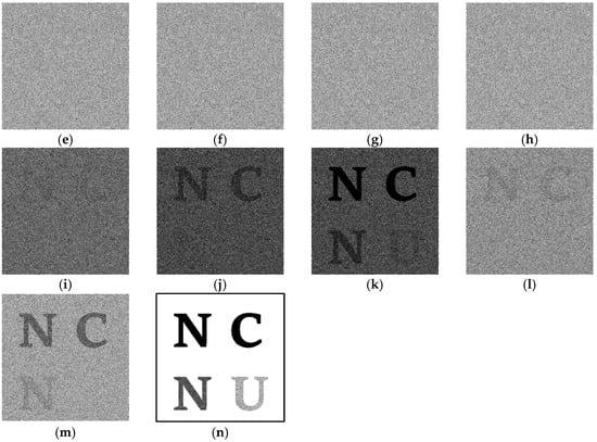 Furthermore, Figure 8g,h and Figure 9g,h show the results of stacking two and three images using the OR decryption method. The contrasts between Figure 8g,h and Sl1 are 0.06517 and 0.35696, respectively, and the contrasts with Sl2 are 0.05313 and 0.32209, respectively. In Figure 9g,h, the contrasts with Sl1 are 0.067229 and 0.31722, while with Sl2, they are 0.012283 and 0.15064. In the XOR decryption part, it can be observed that there is a significant difference in the contrast values between Figure 8 and Figure 9. This demonstrates that even under identical conditions of k, n, S and the number of secret levels, the achieved contrast upon reconstruction varies. For easier reference and comparison, this paper summarizes the contrast values mentioned above in Table 5.
