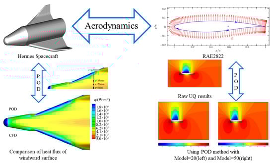 At present, hypersonic vehicles are in a period of vigorous development at home and abroad, and the optimization and design of the aerodynamic characteristics of the aircraft airfoil cannot be separated from the CFD numerical calculation. Nie Chunsheng et al. [26] took the shape of the Hermes aircraft as the research object, obtained a three-dimensional thermal environment database using the CFD numerical method, and used the POD method to reduce the CFD database. Combining the POD method and RBF interpolation, a suitable complex thermal environment database was established. The surrogate model (Surrogate Model, SM) for predicting the heat flow on the shape surface can quickly predict the surface thermal environment parameters that meet the accuracy requirements in an unknown state. On the premise of not losing prediction accuracy, this method can greatly improve the calculation efficiency and effectively make up for the shortcomings of engineering algorithms. Sun Chong et al. [27] carried out a numerical simulation on the static stall and dynamic stall of the S809 airfoil at an angle of attack of 20°. They studied the unsteady flow field around the wing and extracted the static stall and dynamic stall unsteady flow field by using the POD method. The main flow modes of the pressure field were combined with the POD coefficients of the corresponding modes to analyze the unsteady flow, which is of great significance to the study of the stall problem of the wind turbine airfoil. Figure 2 [26,28] shows that research on POD in aerodynamics.