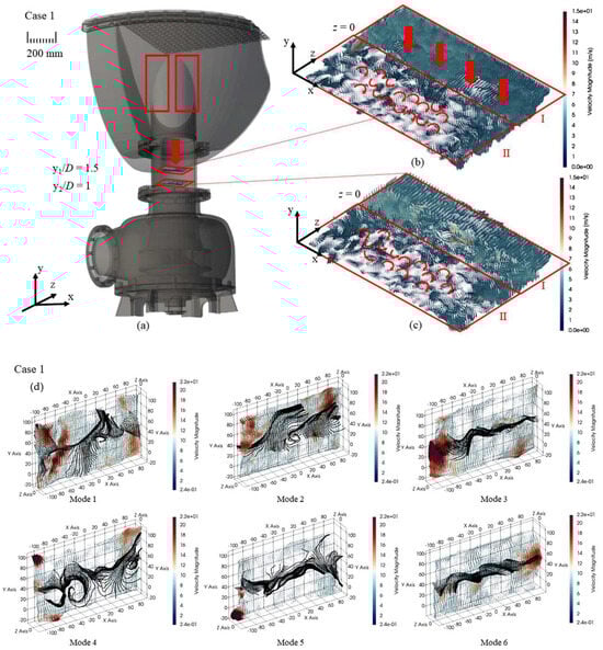 (a) Circumferential non-uniform velocity field of case 1 and 3d geometrical model; (b) the 3D vector at the plane of y1/D; (c) the 3D vector at the plane of y2/D; and (d) the spatial distribution of the POD modes in R1 for cases 1 [51].