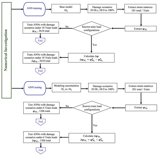 Wei Yun [67] proposed for the first time to embed genetic algorithms and the adjoint method in the POD method, completed the multi-method integrated design of the artificial environment, improved the calculation efficiency of the reverse design on the basis of ensuring calculation accuracy, and realized the artificial environment based on CFD. Efficient global optimization reverse design, based on the POD method, can establish a fast ice shape prediction reduction model [68]. This method can be applied to single- and multi-parameter ice shape predictions and has a reference value for the application of large parameter research. It provides an effective and feasible method for icing flight test certifications and ice-accommodating designs. The POD method is applied to the space–time evolution of supersonic mixed layers under different operating conditions to obtain the time evolution characteristics of the energy modal distribution, as well as modal coefficients, frequency domain characteristics, and the modal space structure [69]. Lv Xiaolong et al. [70] established a POD-RBF proxy model with a good inversion accuracy and generalization performance, and a fast iterative update inversion algorithm, using the POD method to extract the intrinsic vector and the RBF method to interpolate to obtain the surrogate model of the finite element model. At the same time, a new high-efficiency iterative inversion method can be established by combining the global optimization ability of the particle swarm algorithm and the fast local convergence advantages of the Gauss–Newton method. Ahmed Rageh et al. [71] further improved the POD-ANN method in order to study the fatigue and corrosion defects of rivet joints, combining the POD mode extracted from the measured structural response and the orthogonal mode calculated from the numerical model. As a result, the POD-ANN method is a robust fatigue damage identification tool for railway steel bridges. Figure 6 shows the POD-ANN field investigation flowchart.