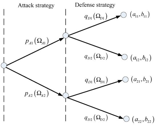 In this section, a specific example with four strategies (, ), (, ), (, ), and (, ) are given for the solution of evolutionary stable equilibrium. The attacking and defending sides choose strategies with different probabilities, and generate different benefits. The game tree is shown in Figure 1.