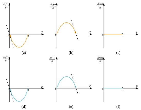 In this section, it is assumed that the attacker selects two attack strategies dynamically, and the defender selects two strategies for defense accordingly. Define as the attack and defense payoffs when they take . The dynamic change rate is expressed by the solution of the replication dynamic equation.