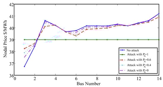 where and are the state variables and line flow vector in real time. and are the measurement noise. The attacker manipulates the electricity prices through modifying the power flow measurement with a vector of false data. With the correction of power flow, the economic dispatch of the power system will also change. The attack will succeed when the following physical characteristics of the system are met: