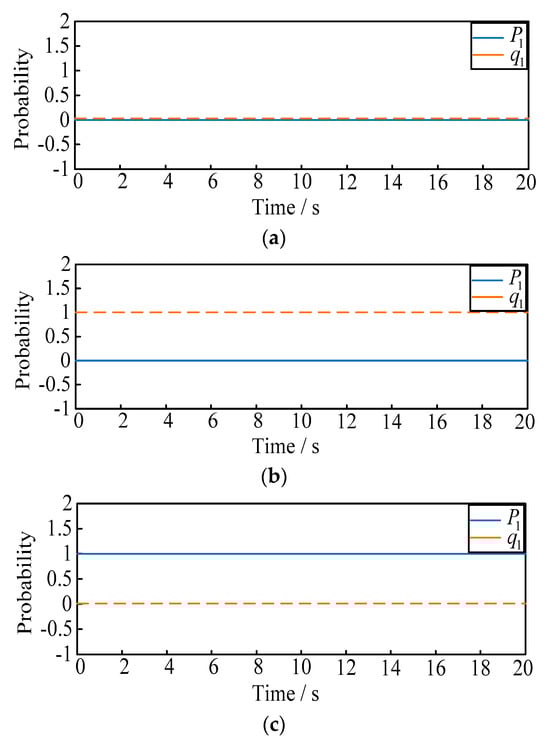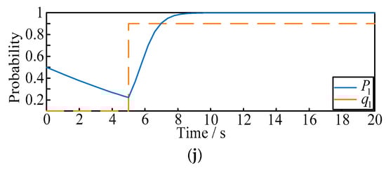 - Situation 2: the initial probability of and are selected as fixed values of 0.5 and 0. When t = 5 s, we make suddenly rise to 0.9, and observe the variation of .
