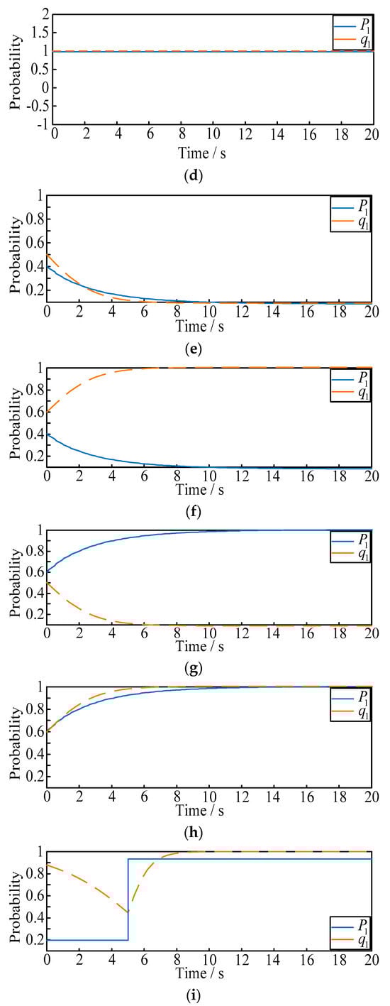 - Situation 1: the initial probability of and are selected as fixed values of 0.2 and 0.9. When t = 5 s, we make suddenly rise to 0.8, and observe the variation of ;