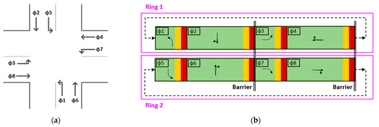 - Furth, P.; Muller, T.H.; Salomons, M.; Bertulis, T.; Koonce, P.J. Barrier-Free Ring Structures and Pedestrian Overlaps in Signalized Intersection Control. Transp. Res. Rec. 2012, 2311, 132–141. [Google Scholar] [CrossRef]