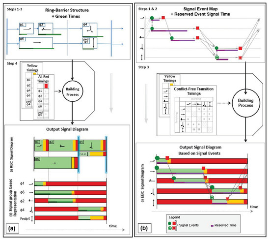 In introducing the EBC signal timing workflow, the architecture of the EBC can be similarly considered (Figure 3b). The development of fixed-time signal control in the EBC entails the following steps, which vary slightly from those in RBC: