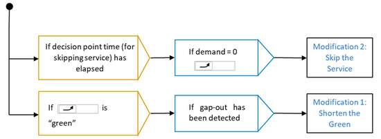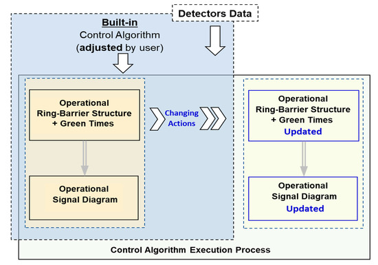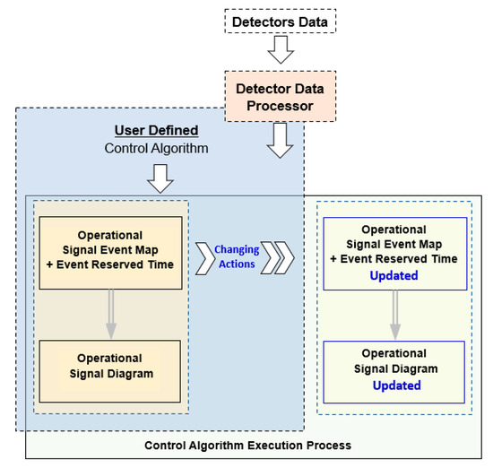 In contrast, the EBC, with advanced functionalities over RBC, can overcome these limitations and offer flexibility in fundamental aspects. Notably, the EBC not only utilizes detector information as input but also incorporates a detector data processor (logical sensor). This sensor processes raw detection data after collection but before it reaches the controller control logic, receiving data from one or more detectors within the EBC system and generating high-level logical quantity values based on the received data. Following the processing of information through a dedicated unit (based on the specific condition), a signal professional can define their own control algorithm for execution. The key distinction between the EBC and RBC, contributing to the flexibility of the EBC, lies in the user’s ability to define his/her own control algorithm based on the given situation. Figure 5 illustrates the process of changing the signal diagram in the EBC based on the detector information and user-defined control algorithm.